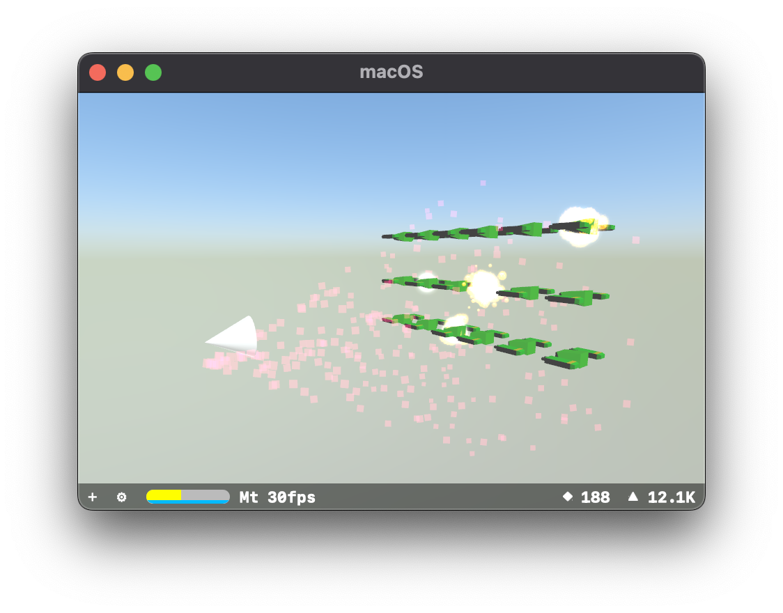 I ran into an issue pretty quickly though, and which took me quite a while to figure out a solution to. I was originally removing/deleting any object that "died". A little showy explosion effect and then removed from the scene. This caused issues with the particles they had interacted with, and the targeting system. This would often also result in a crash due to attempting to perform an operation on a null object.